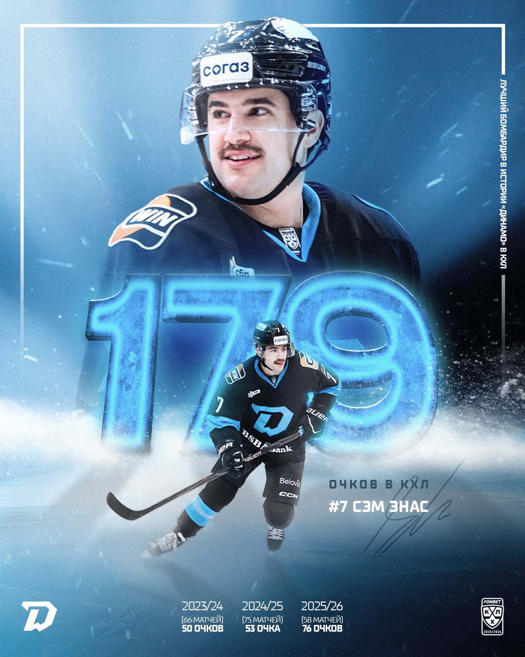 Очередное историческое достижение форварда! Ранее Сэм установил клубный рекорд в КХЛ по количеству шайб за один регулярный чемпионат и стал лучшим ассистентом за всю историю «Динамо» в КХЛ.